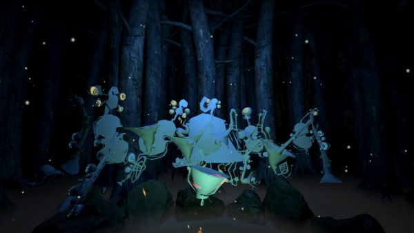 Finally begins the Sabbath, all the instruments of the orchestra surround the visitor around the fire. They then lead the latter in a macabre round, a round of the Sabbath. By following the round of instruments moving in the forest, the player moves into the heart of the orchestra. The bassoons and tuba roar in the ears of the visitor, while the flutes chirp nearby, and the bells come to alert us that the hour of sacrifice is approaching. It is only in the heart of the forest that all the instruments can be heard there, player visitor can stroll and change his sound perception. He can go towards the sound of double basses, like that of the clarinets and of each of the instruments of the orchestra.